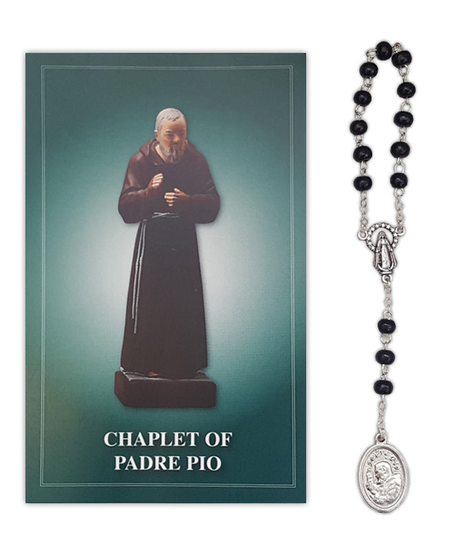 Padre Pio Chaplet and prayer card. The chaplet has sturdy black beads with a silver Padre Pio medal and Mary the Miraculous as a centrepiece.