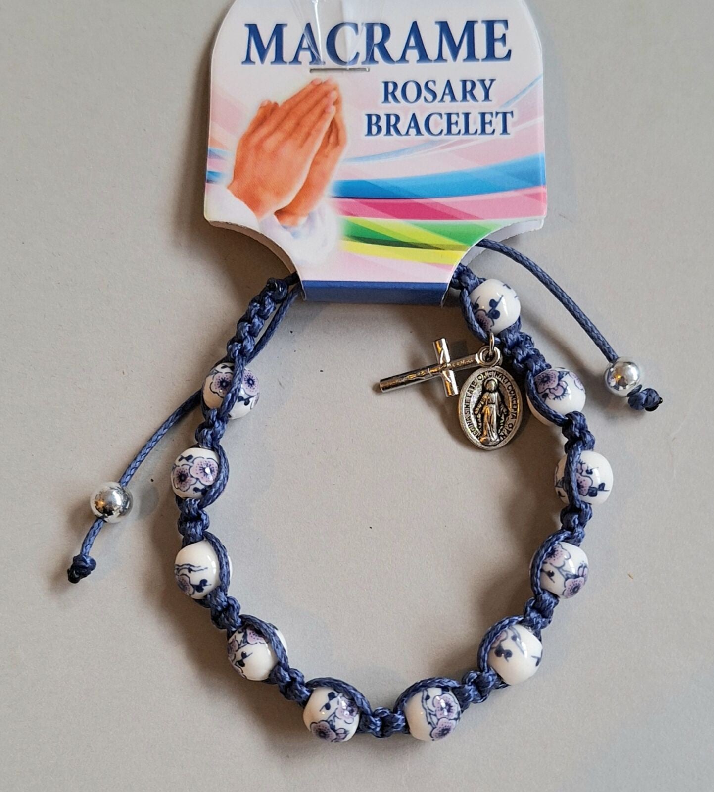 Here we present a Navy Macrame Rosary bracelet with pink and blue florals.