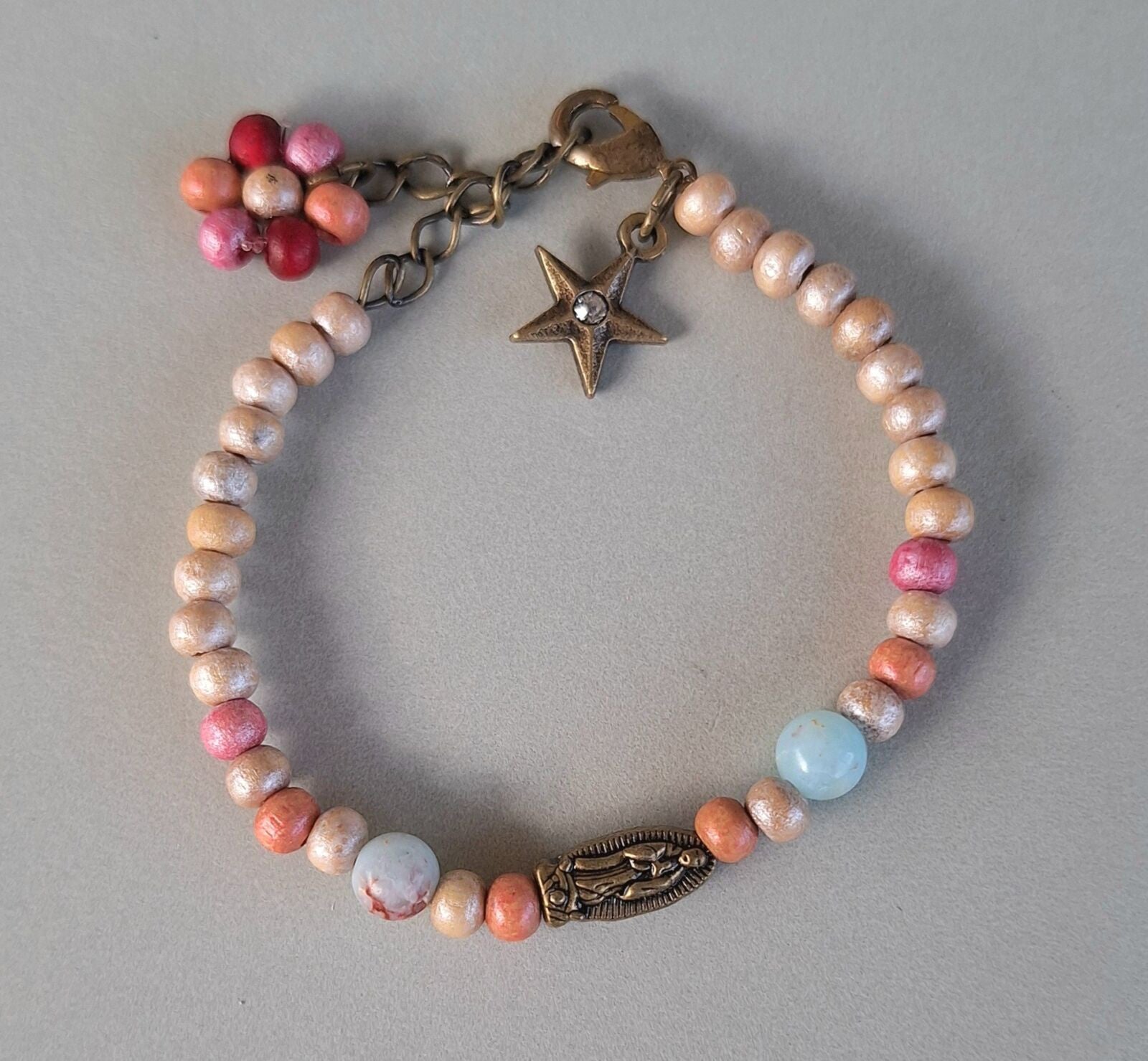 The beads are a soft pastel shade and attached to the bracelet is a bronze star and colourful beaded flower.