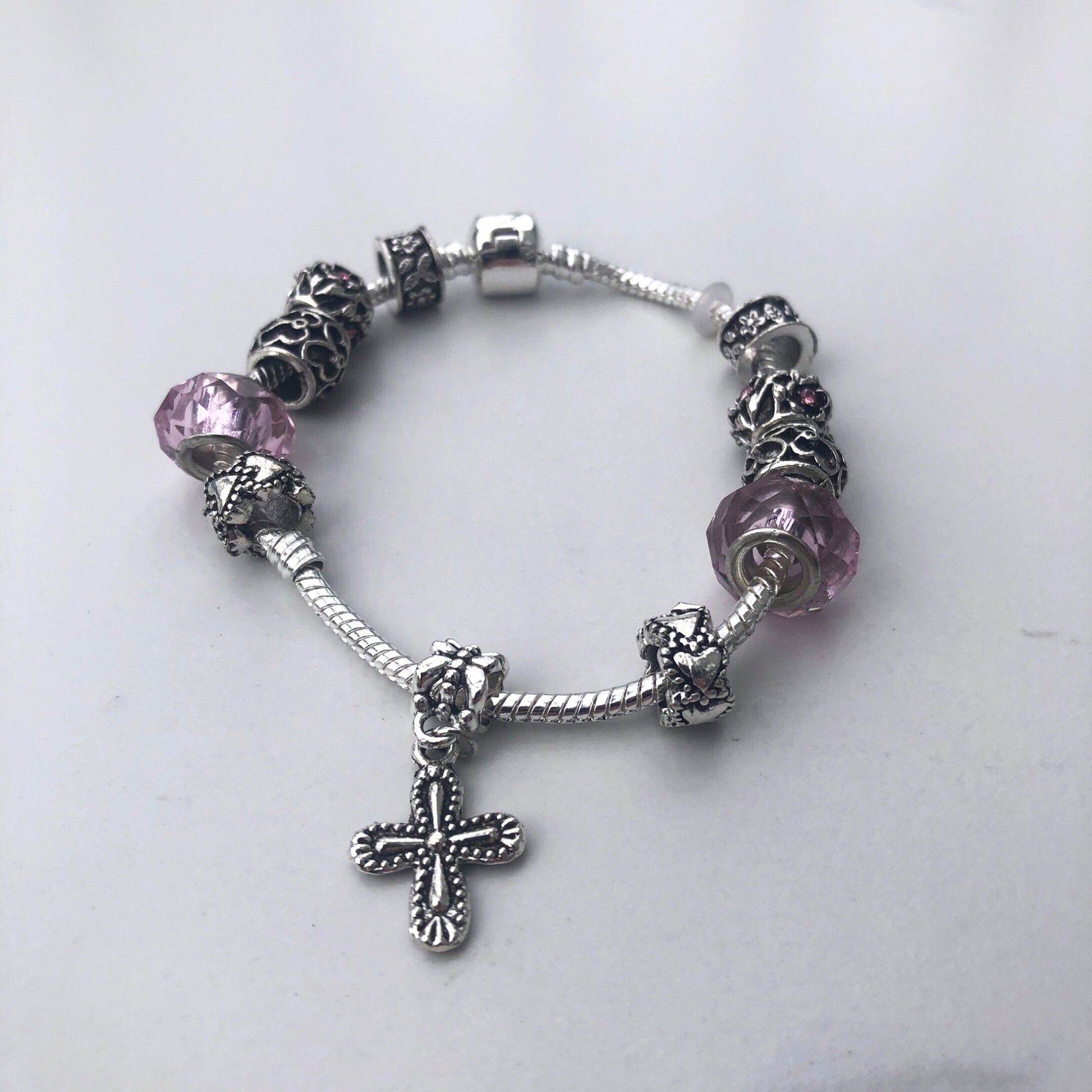 Bracelet - silver charms with cross pink