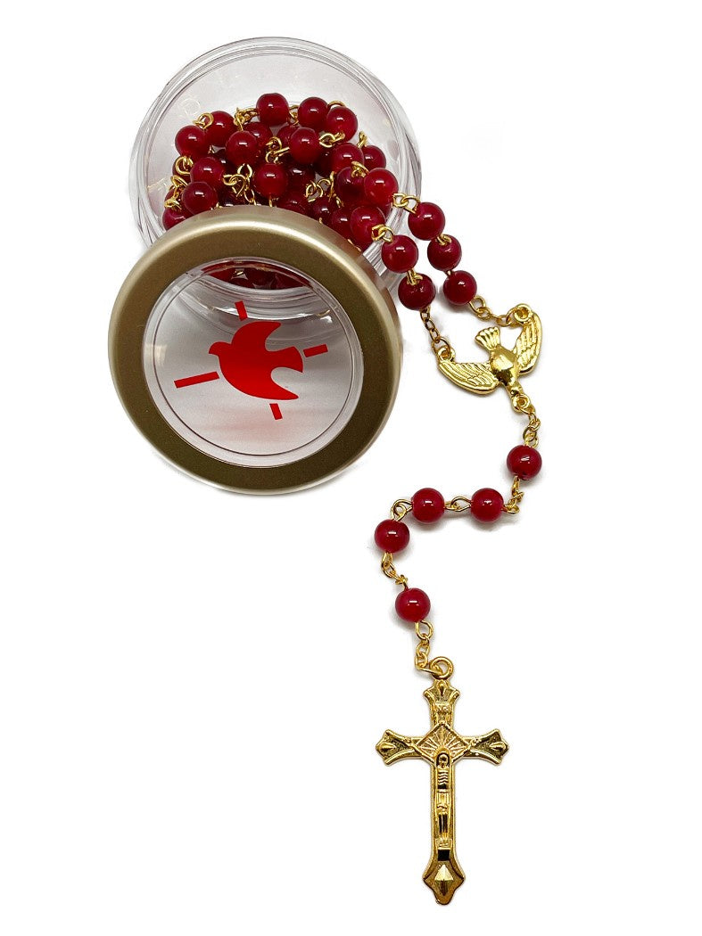This rosary is made from 6mm red, round glass beads. It comes with a golden crucifix and a gold, dove-shaped centrepiece.