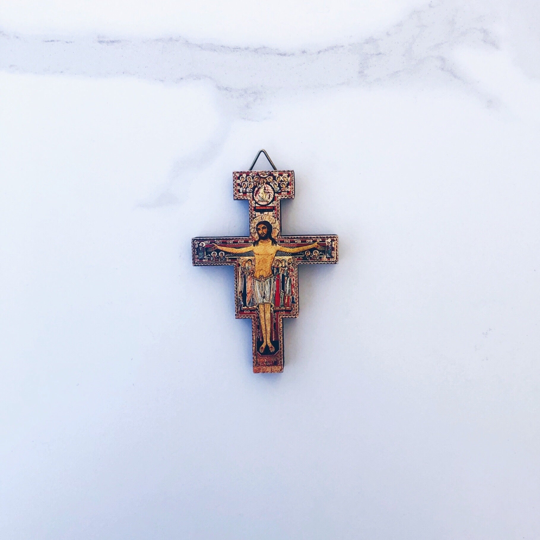The San Damiano Cross is the one St. Francis was praying before when he received the commission from the Lord to rebuild the Church. The original cross presently hangs in Santa Chiarra (St. Clare) Church in Assisi, Italy. All Franciscans cherish his cross as the symbol of their mission from God.