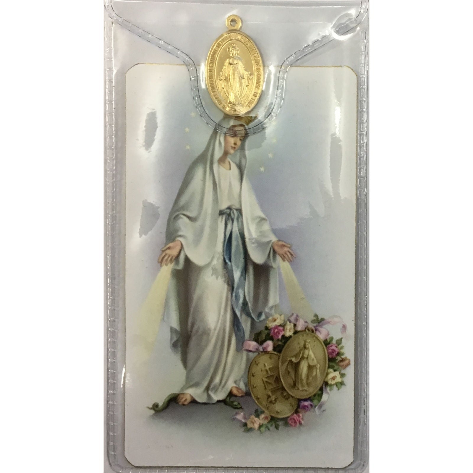 The Holy card depicts Our Lady of the Miraculous Medal.
