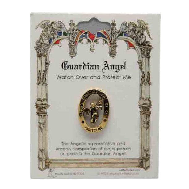 This Guardian Angel lapel pin is gold in colour. It features an image of a Guardian Angel with this written around the border.