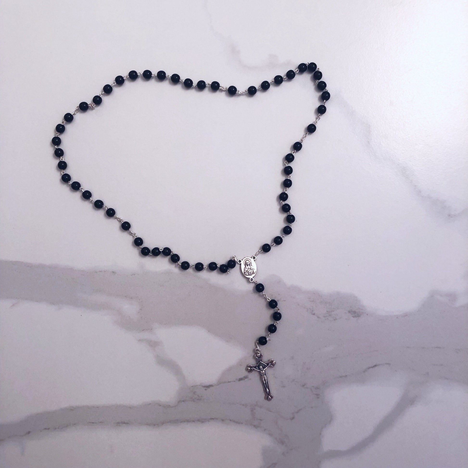Rosary with black 7mm beads using the Traditional Spring Ring method.