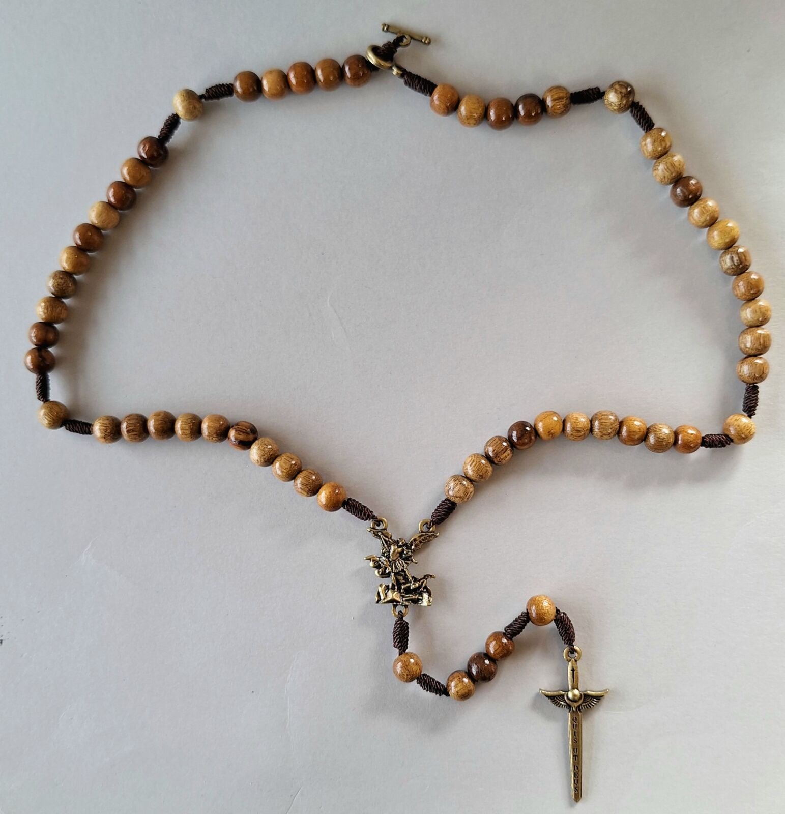 This lovely Brazilian Walnut Wood Rosary, strung on cord, has a St Michael theme.