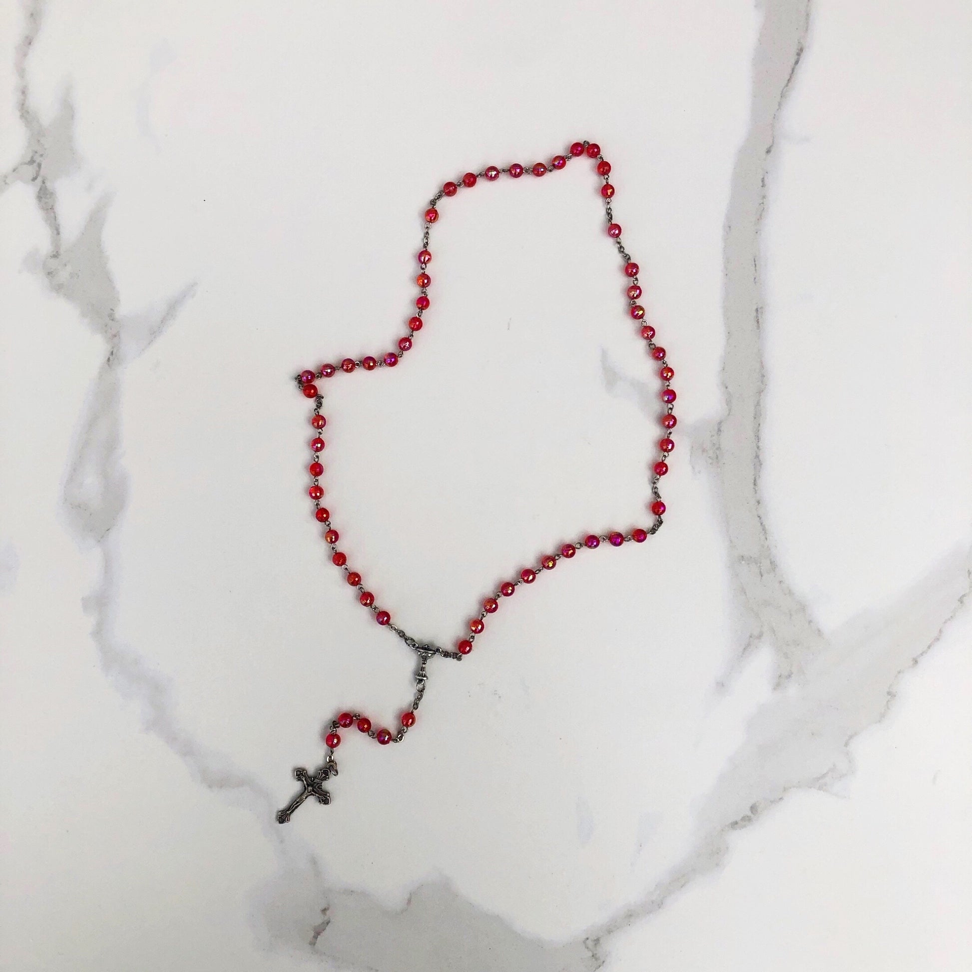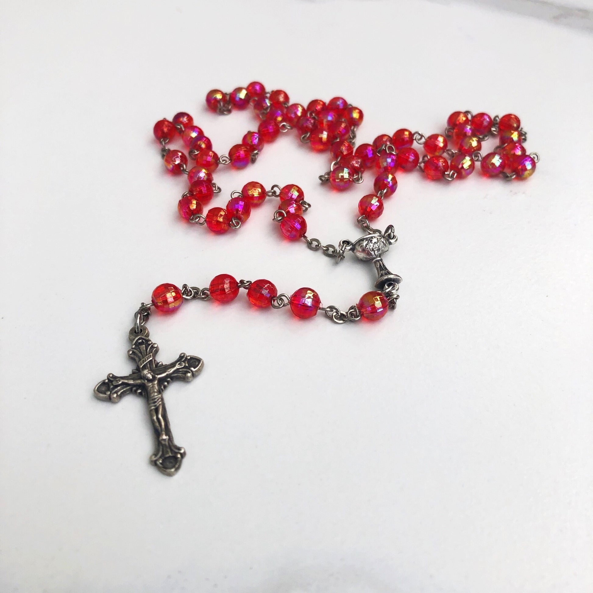 Crucifix, chain and chalice centrepiece are silver in colour. Beads are made from acrylic. The crystal shimmer is through the entire bead so the colour won't wear off.